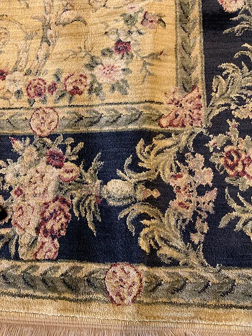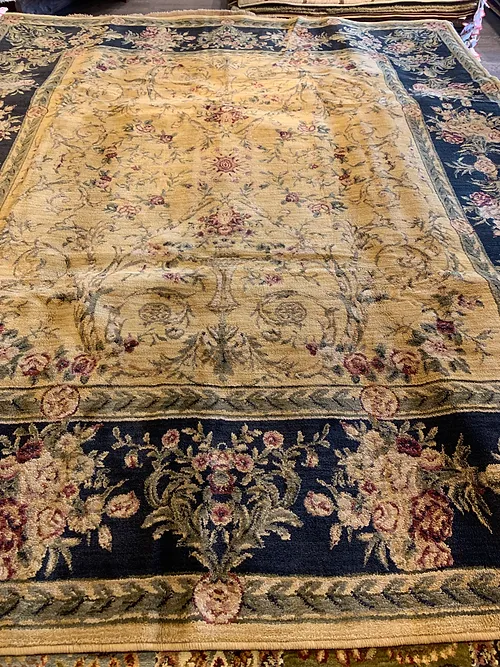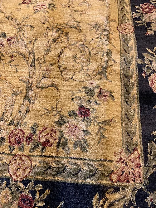 This is a beautiful machine made rug made in USA. The material is 100% Nylon pile. The color is gold. The size is 7’ 9” x 9’ 9”. The shipping is within mainland USA. Outside of USA please inquire about shipping before purchasing this rug.