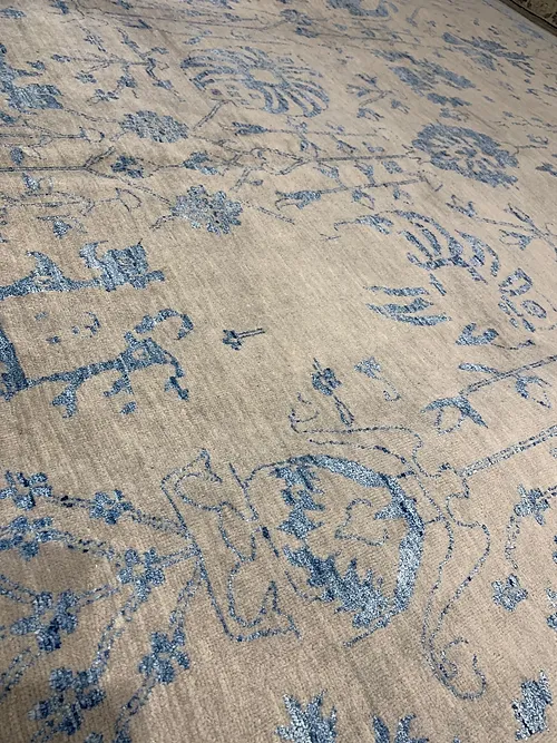 This one is a hand knotted rug made in India. The color is blue. The size is 10’ X 13’ 9”. The material is 100% wool pile. The shipping is for mainland USA. Outside of USA please inquire about the shipping before purchasing this rug.