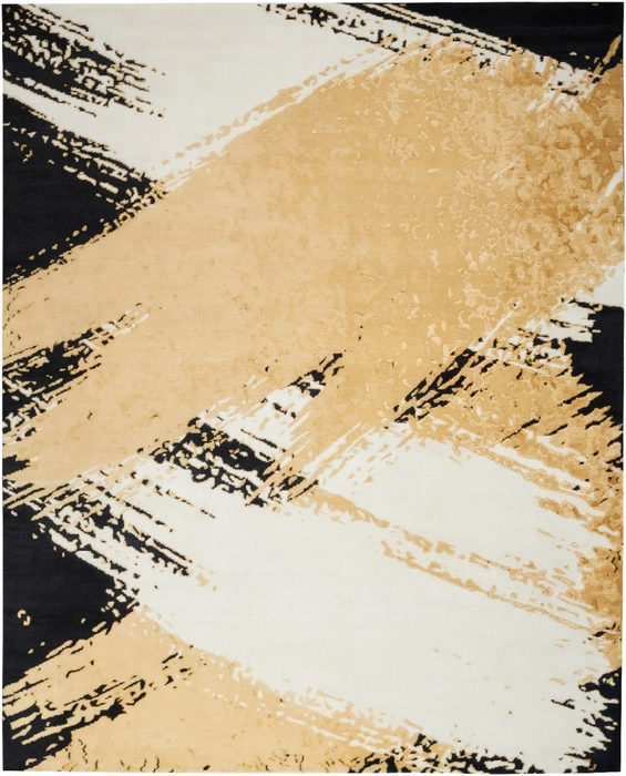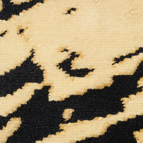 A delight for the senses, this Christopher Guy rug creates a bold statement in any room. Richly hued strokes of gold and ivory stand out vividly against its black ground, with hand-carved accents that add a subtle sense of depth. Hand-knotted from a luxurious blend of silk and New Zealand wool.