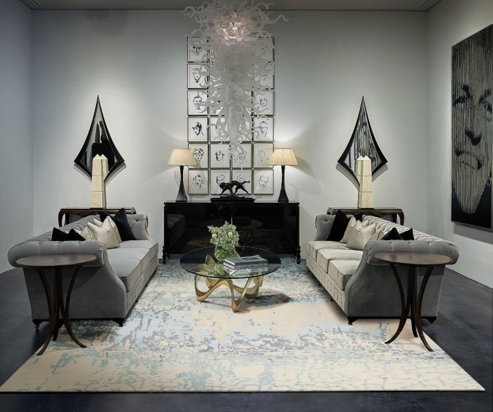 Dramatic textural patterns and rich, elegant colors give this Christopher Guy rug a thoroughly modern look. Raised pile design imbues the wool and silk with an artfully distressed style, with beautifully balanced tones of beige, grey, blue, and teal, creating a centerpiece for your home that’s both dramatic and serene.