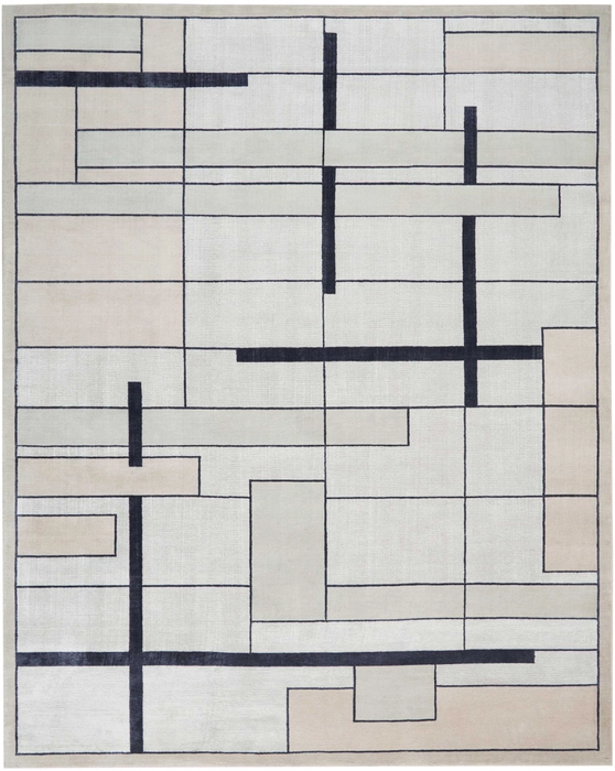 Striking black accents enhance the silvery moon of this rug, hand-woven from wool and silk.