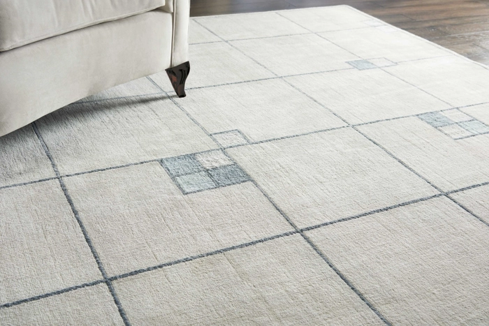 Graphite detailing on rich sand are showcased in this wool/silk rug offering a metropolitan elegance.