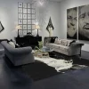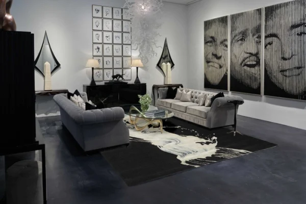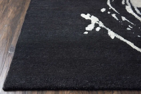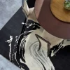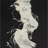 Natural light gris and blanc is set on a canvas of deep noir, creating a flowing and dynamic design of wool and silk.