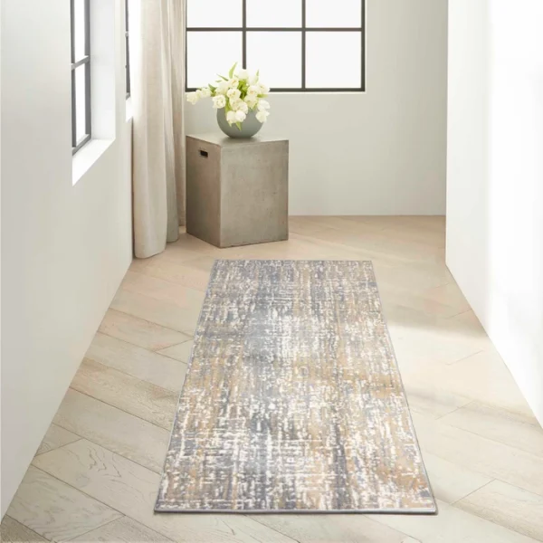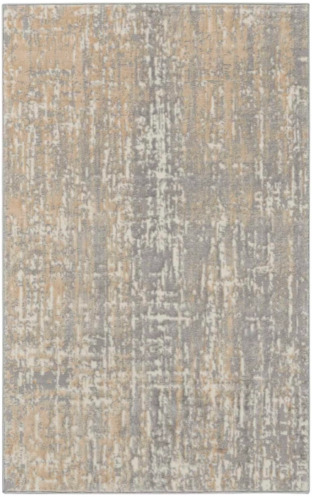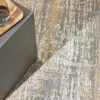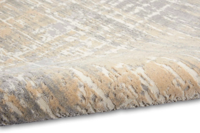 Versatile. Unique. Sophisticated. The Calvin Klein Enchanting Collection area rug. Its abstract design flows in energetic currents of modern grey and beige, enhanced by the texturally pleasing high-low cut pile. In a modern fiber blend designed for ease of cleaning and durability.