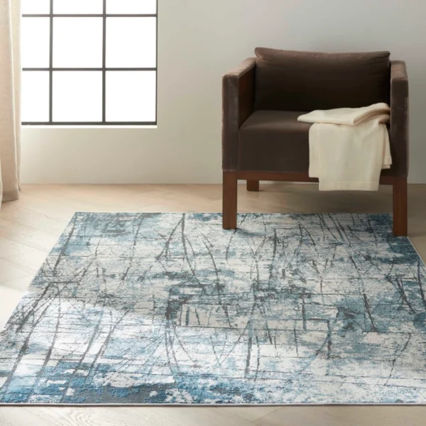 This ultra-modern area rug from the Calvin Klein Vapor Collection adds excitement to any contemporary room. The arresting design features powerful slashes of black, across an artfully blended blue and grey background. In a super-soft, easy-care, medium pile.