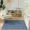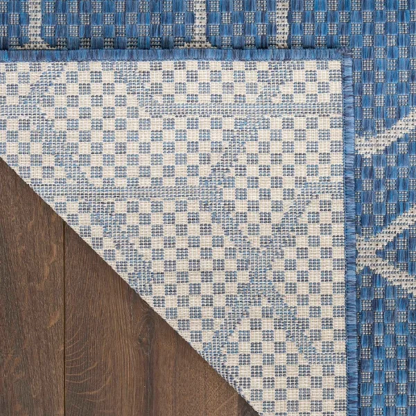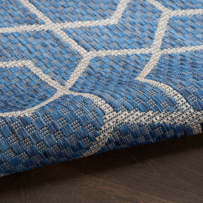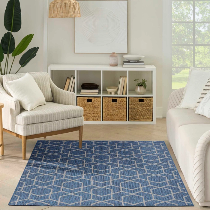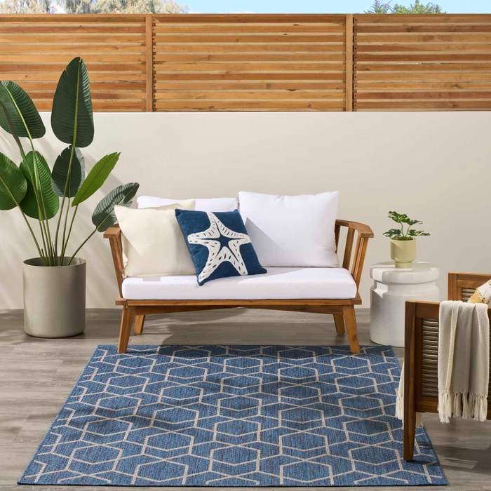 Sleek and modern, this denim blue geometric outdoor rug from the Horizon Collection offers a contemporary take on classic design. The eye-catching pattern effortlessly complements a variety of settings from urban balconies to cozy living rooms while adding depth and visual appeal. This flatweave rug is made from a blend of polyester and polypropylene with a subtle high-low pile and tonal variations.