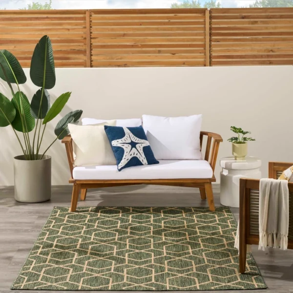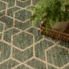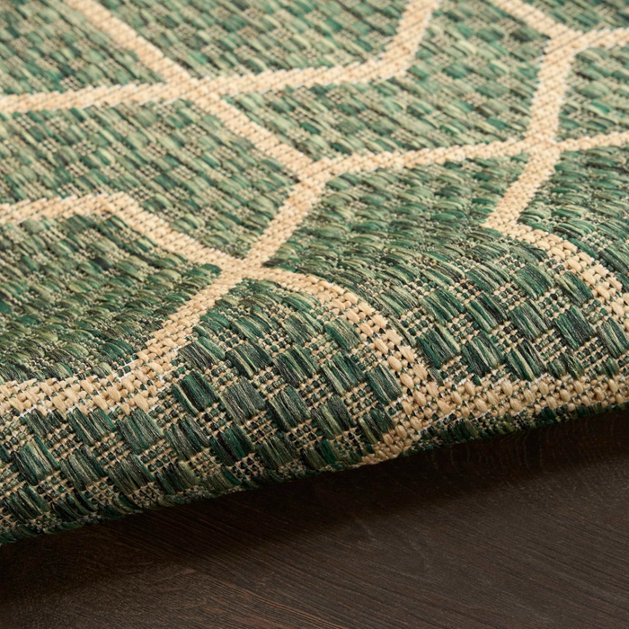 Sleek and modern, this green geometric outdoor rug from the Horizon Collection offers a contemporary take on classic design. The eye-catching pattern effortlessly complements a variety of settings from urban balconies to cozy living rooms while adding depth and visual appeal. This flatweave rug is made from a blend of polyester and polypropylene with a subtle high-low pile and tonal variations.