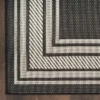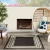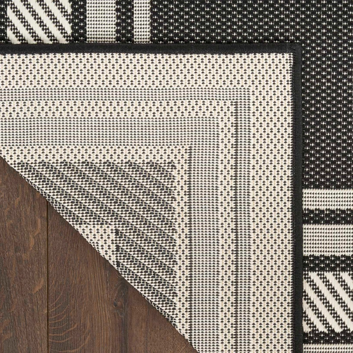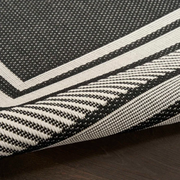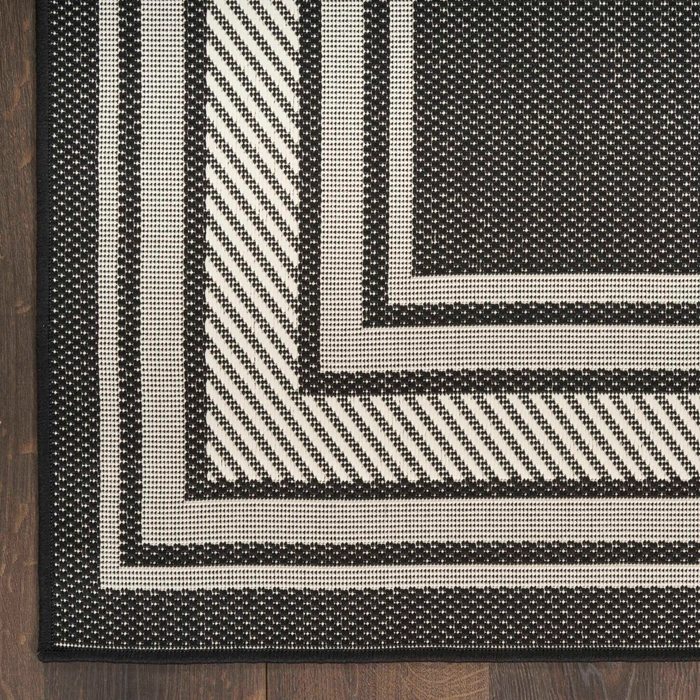Transform any space with this modern black outdoor rug from the Horizon collection. Showcasing a striking bordered design, this rug beautifully frames your space while adding structure to patio conversation or living room and dining room seating areas. The two-tone palette, enhanced with subtle tonal variations, helps draw the eye while creating a focal point for your dcor. Made from a blend of polyester and polypropylene finished with a subtle high-low pile.