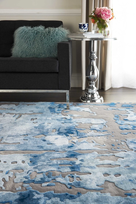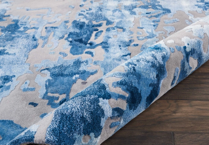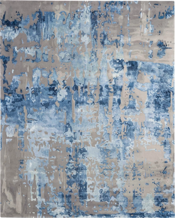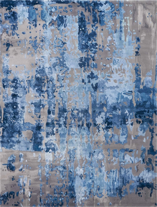 This amazingly artistic rug could adorn a wall as easily as a floor, with its modern abstract design and rich use of blue and grey hues. This hand-tufted rug features a thick, luxurious wool blend pile, carved for added dimension and texture for the perfect combination of durability, comfort, and artistic appeal.