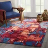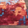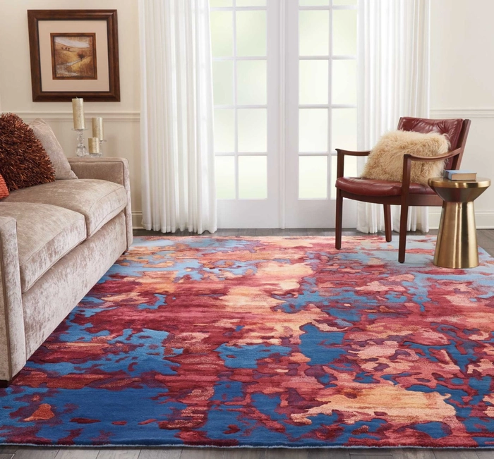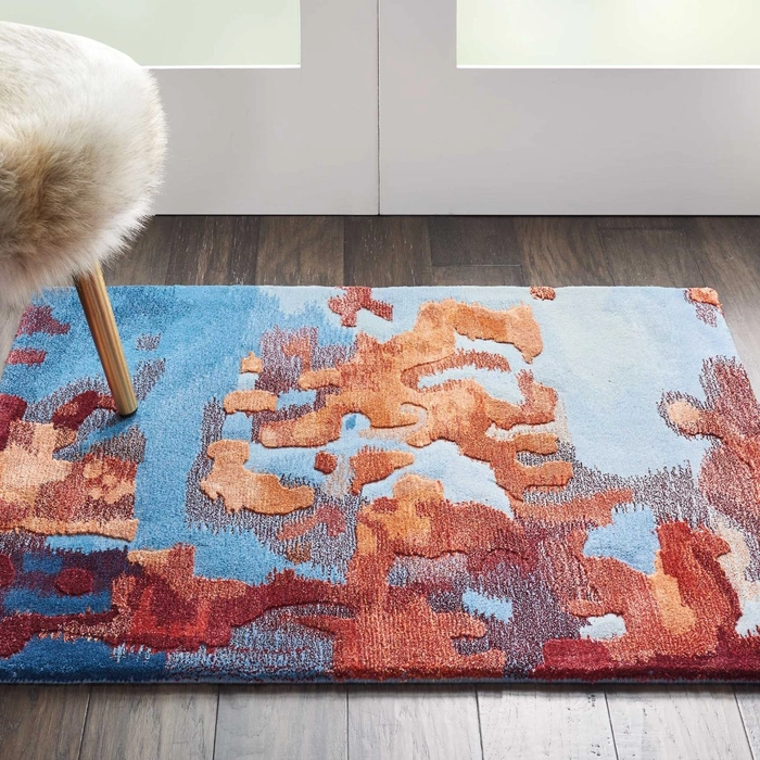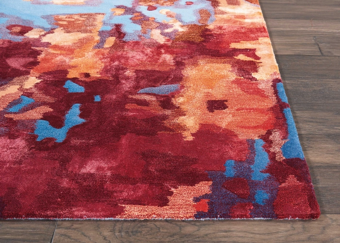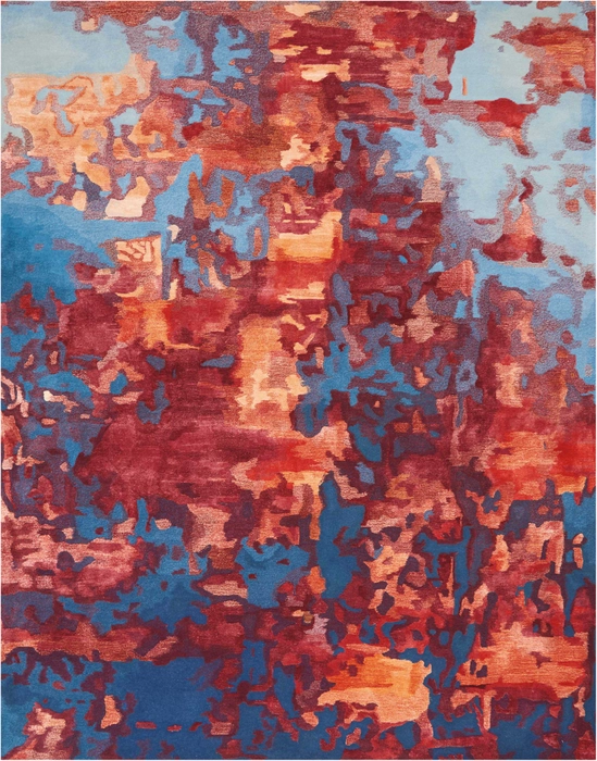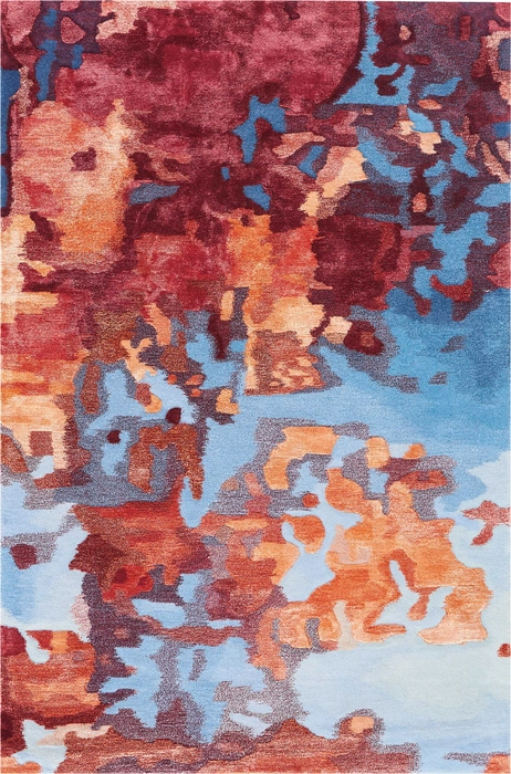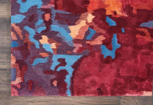 With fiery red abstract designs on a deepening sky-blue field, this Prismatic area rug brings an intense, natural beauty wherever it goes. The luxurious hand-tufted pile is carved for added dimension and texture for the perfect combination of durability, comfort, and distinctive style statement.