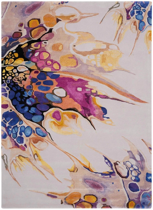 Captivatingly vivid color seems to splash across the surface of this sensational Prismatic area rug. The abstract design hints at floral motifs and natural forms, in a beautifully balanced and painterly rug. The luxurious blend of wool and shimmering, silk-like Luxcelle fibers adds to the beauty of its sophisticated palette in multicolor shades of grey, purple, gold, beige, blue, and yellow. This exceptionally soft, hand-tufted cut pile works beautifully in contemporary, modern, and eclectic décor.