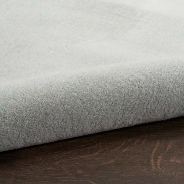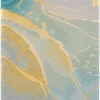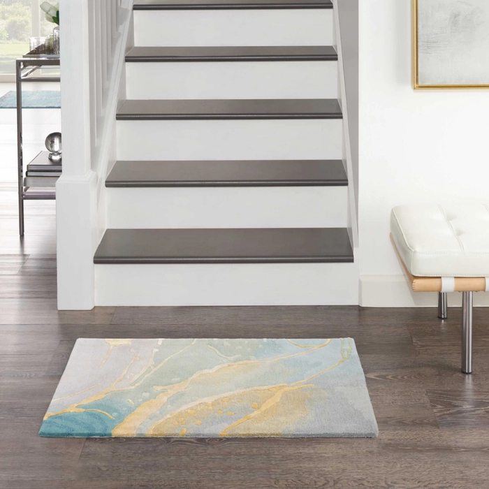 Evoke a sense of calm with this modern rug from the Prismatic Collection. Abstract ripples of grey and blue are accented by swirls of gold that seemingly radiates from its softly hued ground. Hand carved for an added sense of depth, its a standout foundation for your living room or bedroom dcor. This handmade rug is crafted from a fabulously textured blend of New Zealand wool and silky Luxcelle.