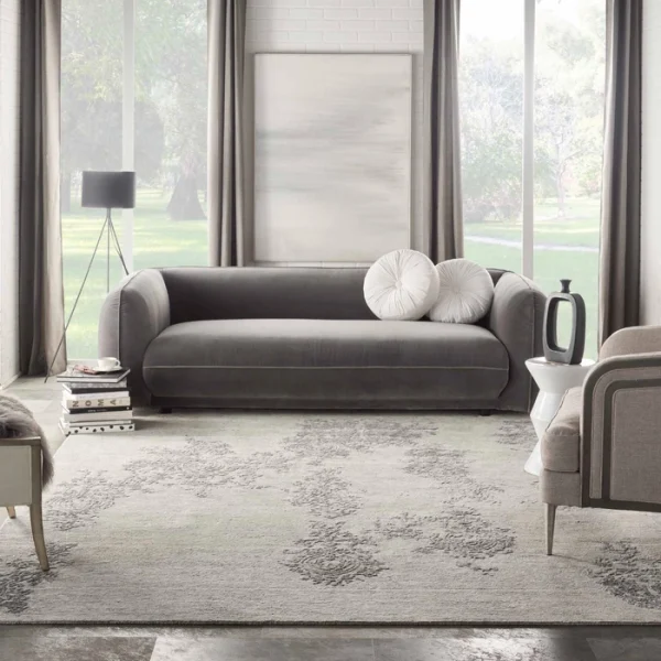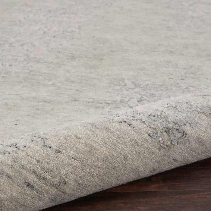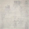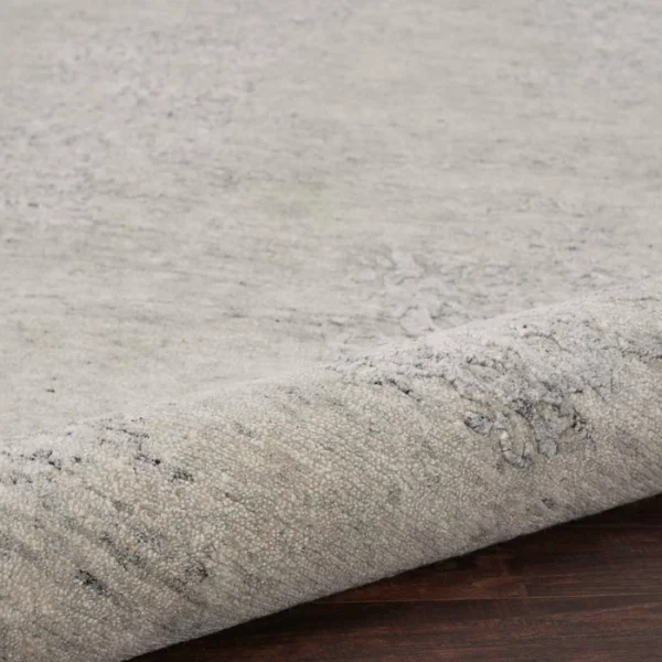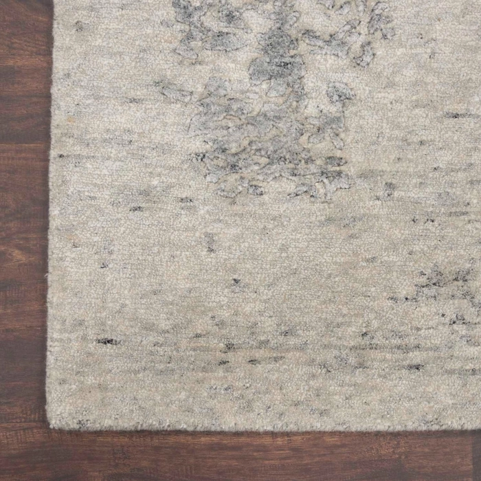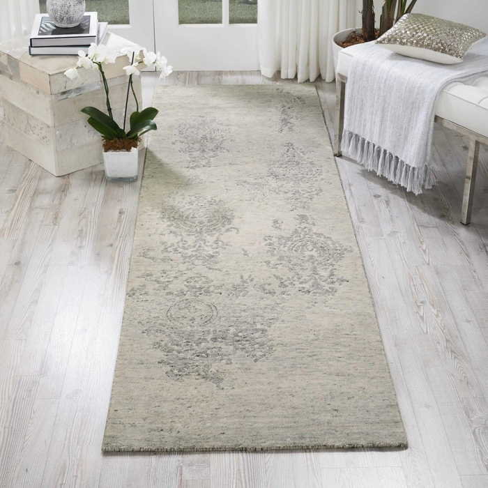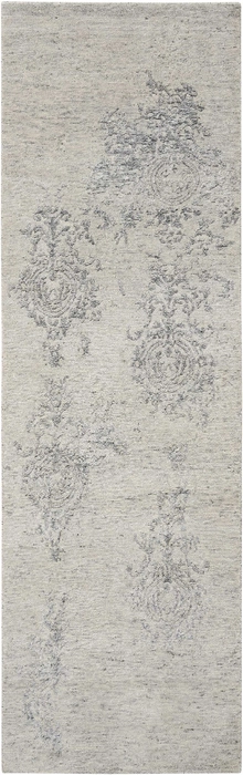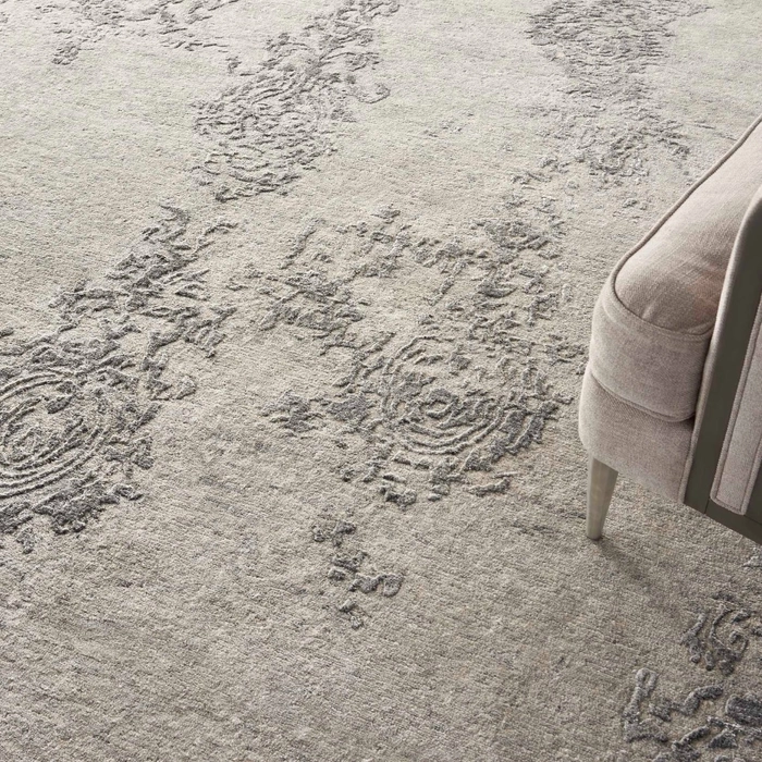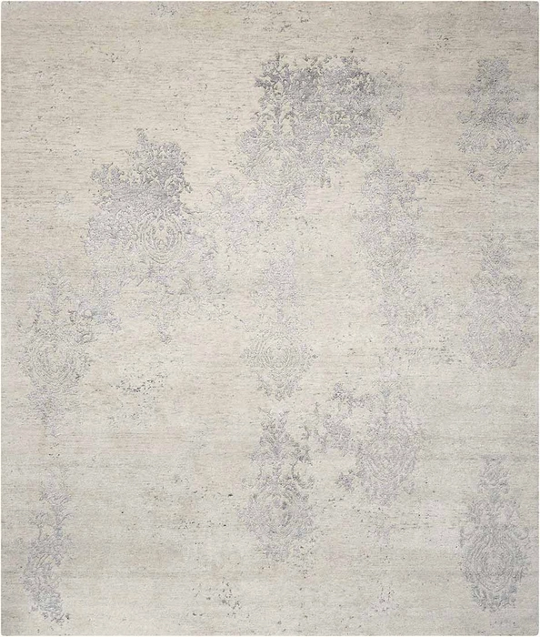 Gorgeously gradated tones of ivory and silver lend an air of antiquity to a traditional Damask design. Expertly hand woven from sumptuous wool with silk-like bamboo fibers for a prismatic shimmering effect, this riveting rug offers a texture and tone that are simply spell binding.