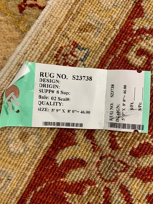 This is a fine hand knotted rug. The design is called Oushak. It is made in Pakistan.The material is 100% wool pile. The background is Ivory with Rust border. The size is 5’ 9”x 8’ 0”. The shipping is within USA. Outside of USA please inquire about shipping before purchasing this rug