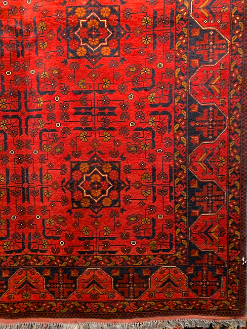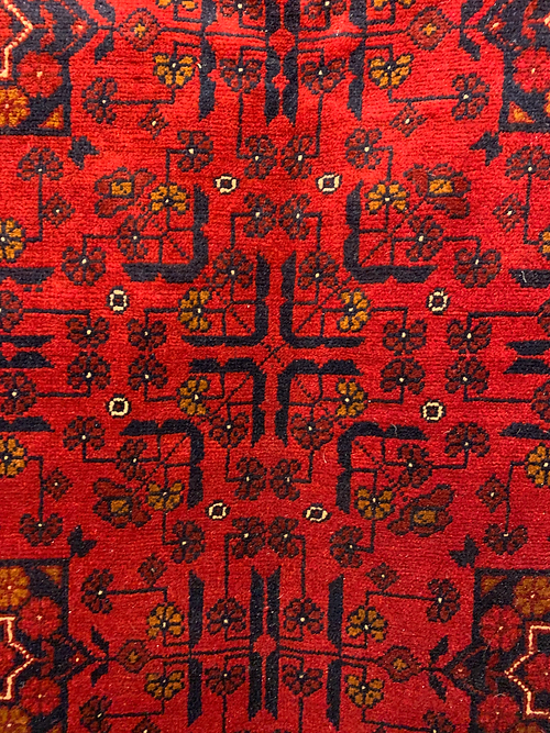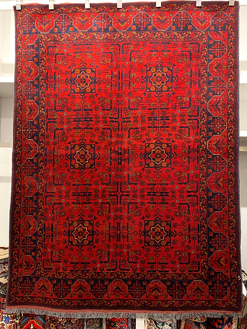 This is a hand knotted Bokara design made in Pakistan. The material is wool pile on cotton foundation. The size is 6’ 8” x 5’. The color is red/ Navy. The shipping is for mainland USA. Outside of USA please inquire about shipping before purchasing this rug.