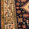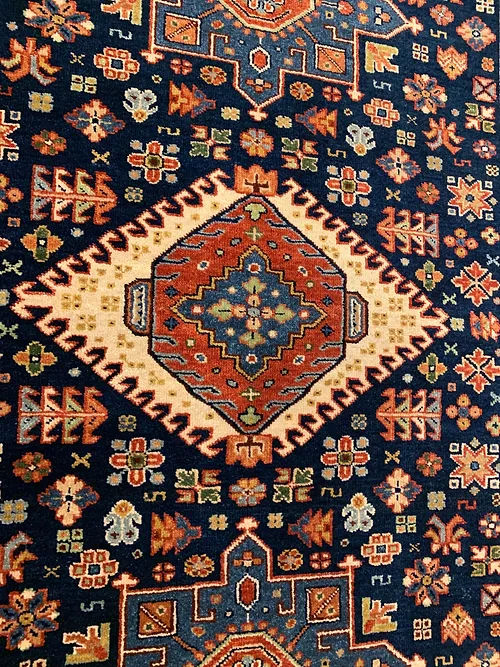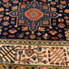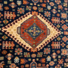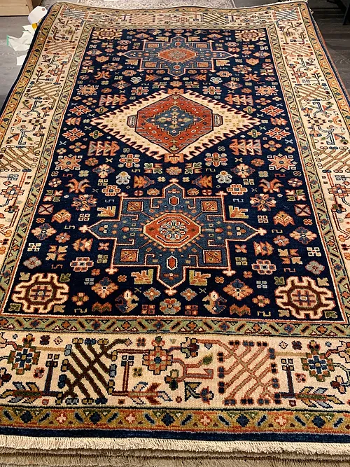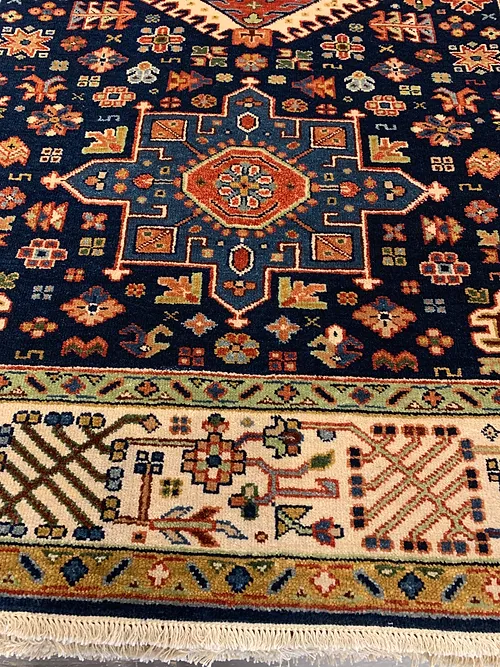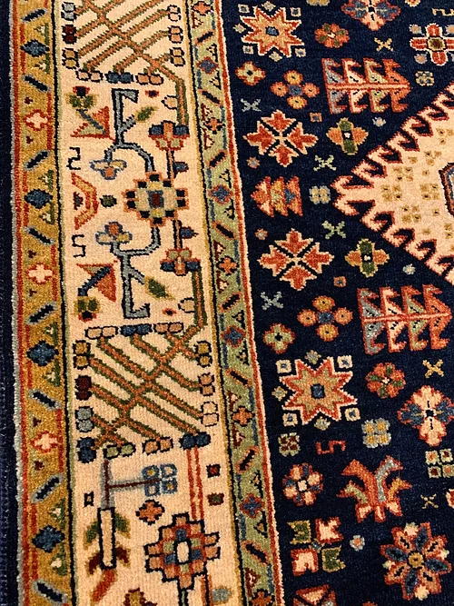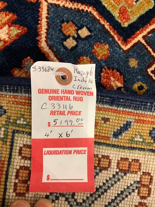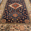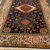This is a hand knotted rug made in India. The size is 4’ x 6’. The material is wool pile on cotton foundation. The colors are navy background with navy ivory border. The design is called KARAJEH. The shipping is within mainland USA. Outside of USA please inquire about shipping before purchasing this rug.