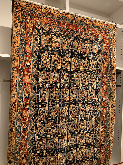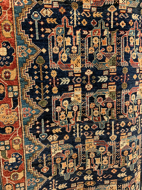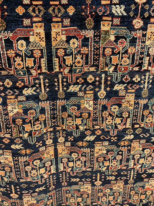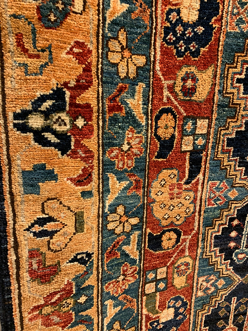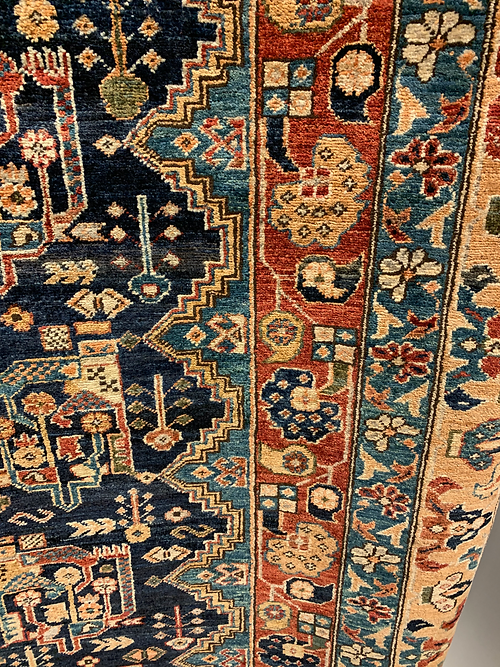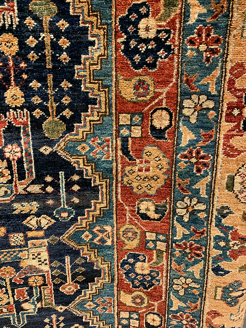 This is a Serapi design hand knotted rug made in Pakistan. The material is 100% wool. The color is navy / red. The size is 8’ 10” x 5’ 10”. The shipping is within mainland USA. Outside of USA please inquire about shipping before purchasing this rug.