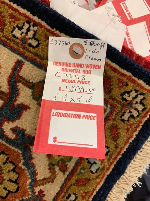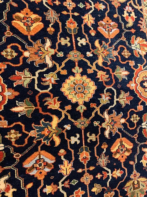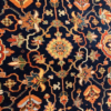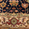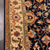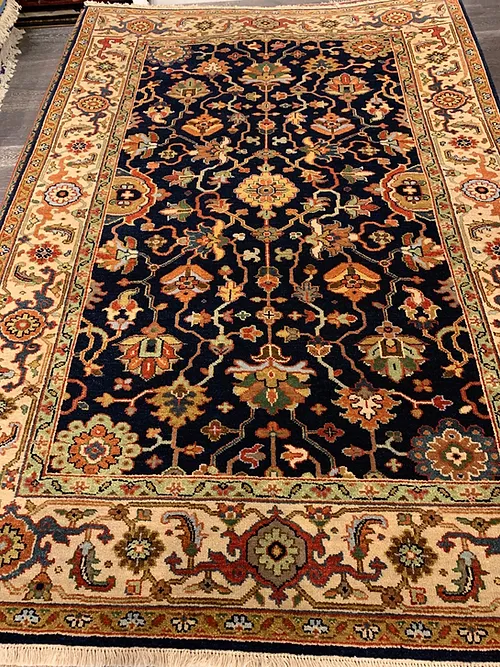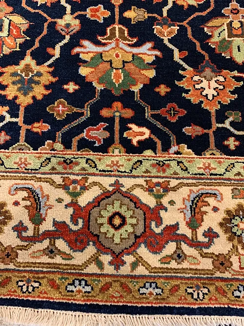 This is a hand knotted rug made in India. The size is 3’ 11” x 5’ 10”. The material is wool pile on cotton foundation. The colors are navy blue background with ivory border. The design is allover Serapi. The shipping is within mainland USA. Outside of USA please inquire about shipping before purchasing this rug.