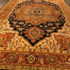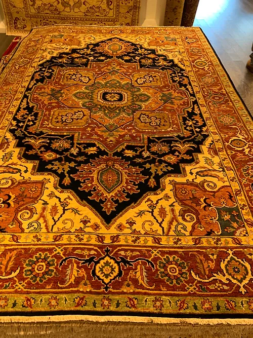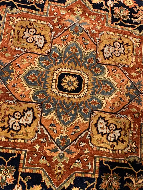 This is a fine hand knotted rug. The design is called Serapi. It is made in India. The material is 100% wool pile. The background is Navy with Rust border. The size is 5’ 11” x 8’ 11”. The shipping is within USA. Outside of USA please inquire about shipping before purchasing this rug
