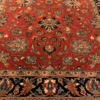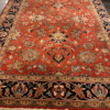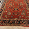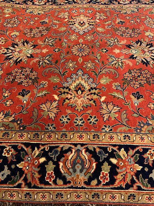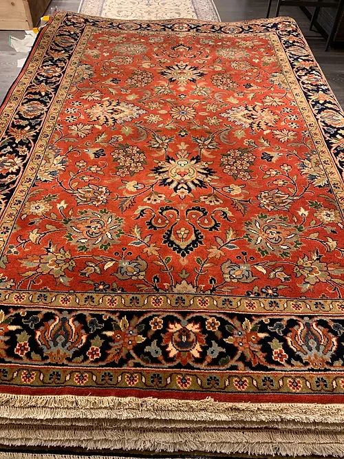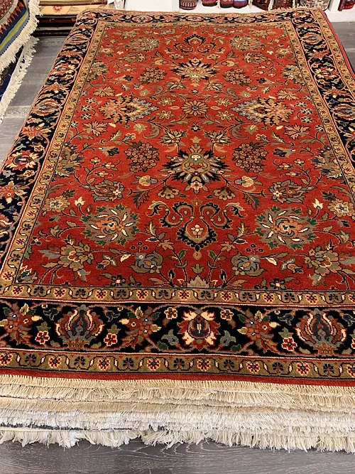 This is a hand knotted rug made in India. The size is 4’ x 6’. The material is wool pile on cotton foundation. The colors are red background with navy blue border. The shipping is within mainland USA. Outside of USA please inquire about shipping before purchasing this rug.