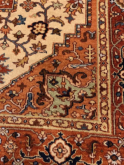 This is a hand knotted rug made in India. The size is 4’ x 6’ 1”. The material is wool pile on cotton foundation. The colors are ivory background with rust border. The design is Heriz Serapi. The shipping is within mainland USA. Outside of USA please inquire about shipping before purchasing this rug.