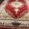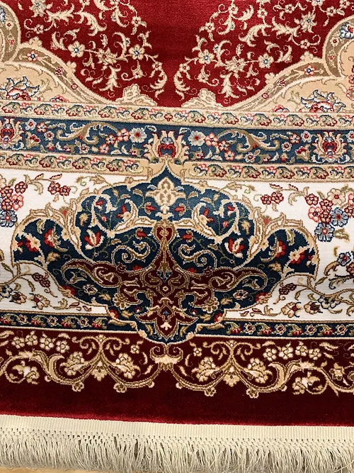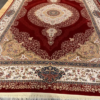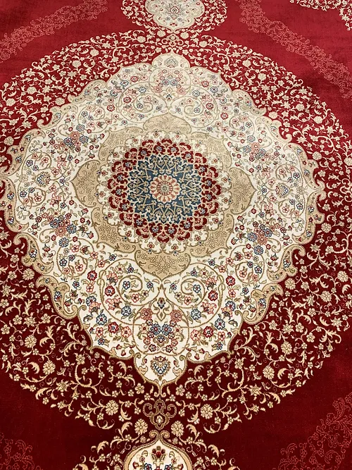 This is very fine machine made rug. It is made in Turkey. The material is 100% Bamboo silk . In rug industry the quality is measured by 2 million points per square meter. The colors are red background with ivory border. The size is 6’ 4” x 9’ 6”. The shipping is within mainland USA. Outside of USA please inquire about shipping before purchasing this rug.