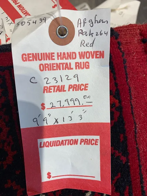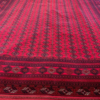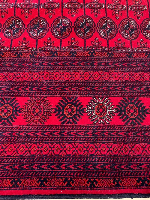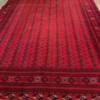 This is a fine hand knotted rug. The design is called Bokhara. It is made in Pakistan. The material is 100% wool pile. The background is red with red border. The size is 9’9” x 13’ 3”. The shipping is within USA. Outside of USA please inquire about shipping before purchasing this rug