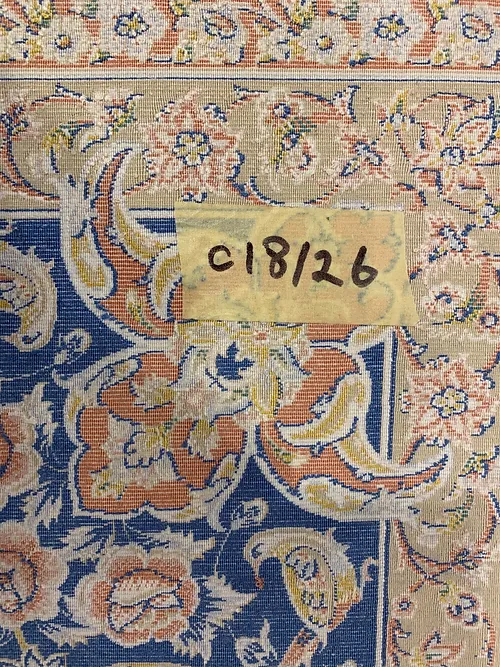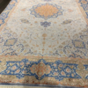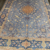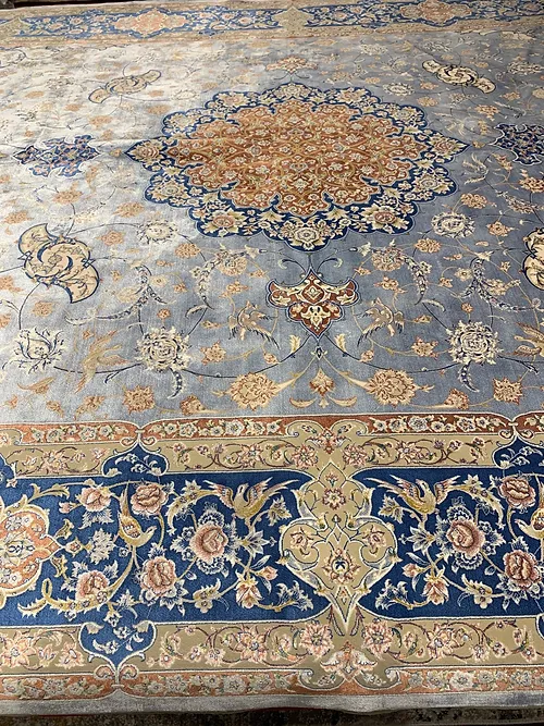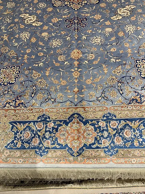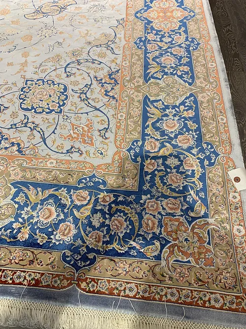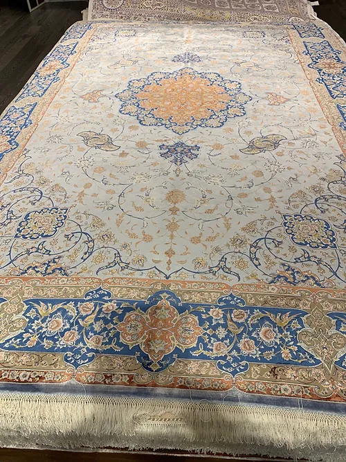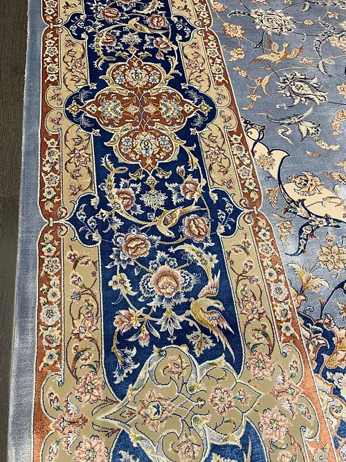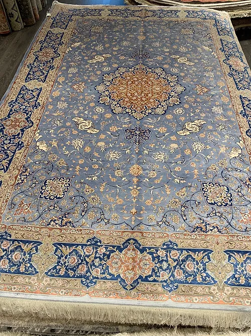 Here is a very beautiful machine made Persian rug. The design is Qum (Ghom). The size is 6’ 7” x 9’ 7”. The color light blue with navy blue border. The material is bamboo silk. The shipping is for mainland USA. Outside of USA please inquire about shipping before purchasing this rug