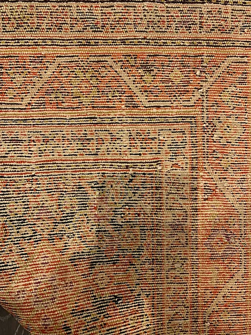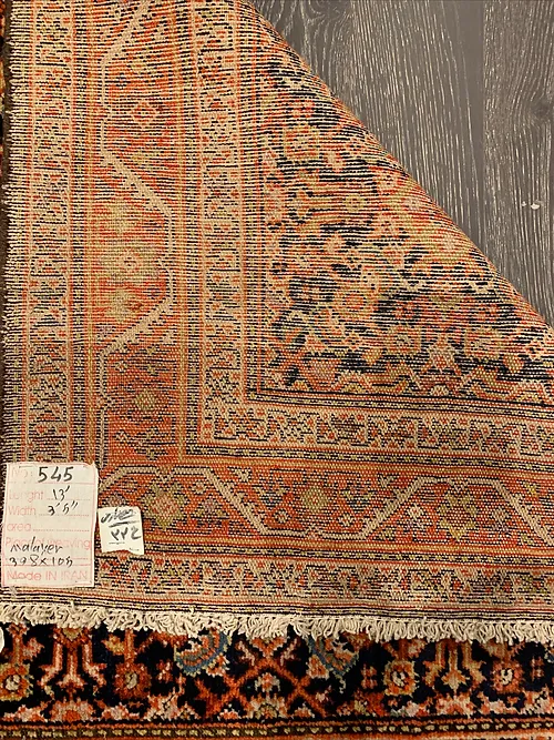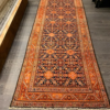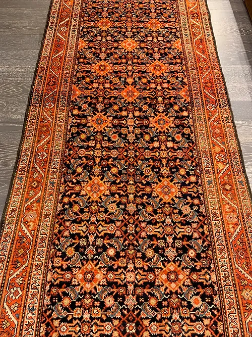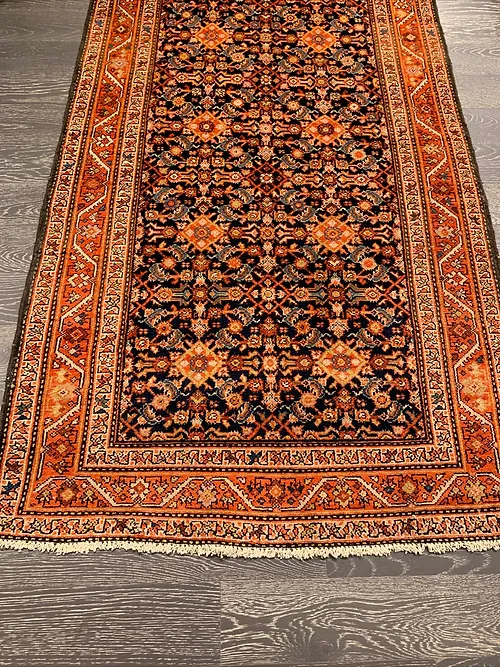 This is an antique genuine Persian runner about 100 years old made in Iran. The design is called Malayer from the city of Farahan. The material is 100% wool pile. The color is navy background with rust border. The size is 3’ 4” x 13’. The shipping is for mainland USA. Outside of USA please inquire about shipping before purchasing this beautiful piece of art.