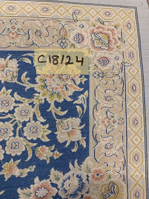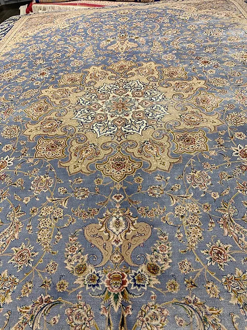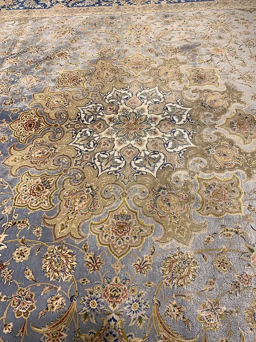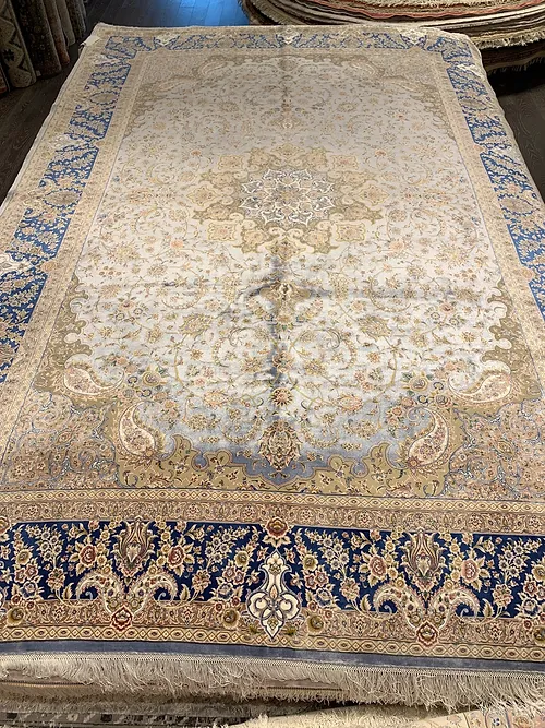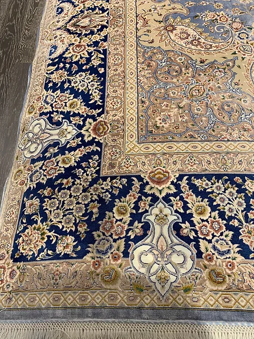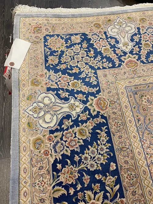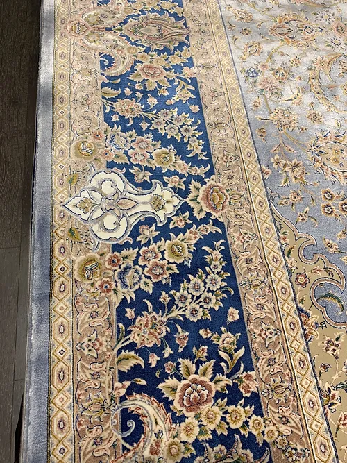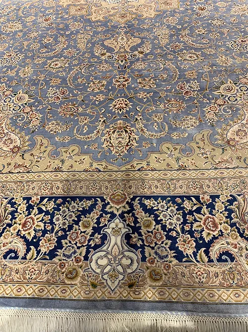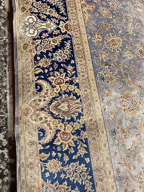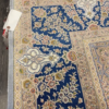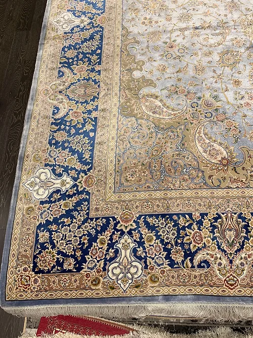 Here is a very beautiful machine made Persian rug. The design is Qum (Ghom). The size is 6’ 7” x 9’ 7”. The color light blue with navy blue border. The material is bamboo silk. The shipping is for mainland USA. Outside of USA please inquire about shipping before purchasing this rug