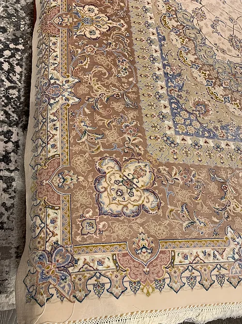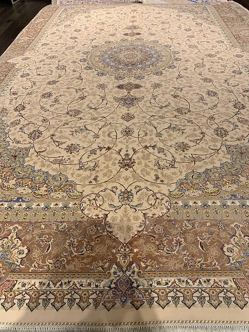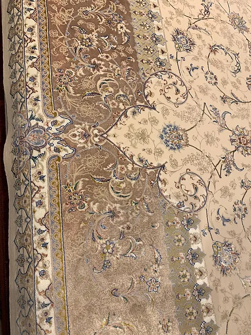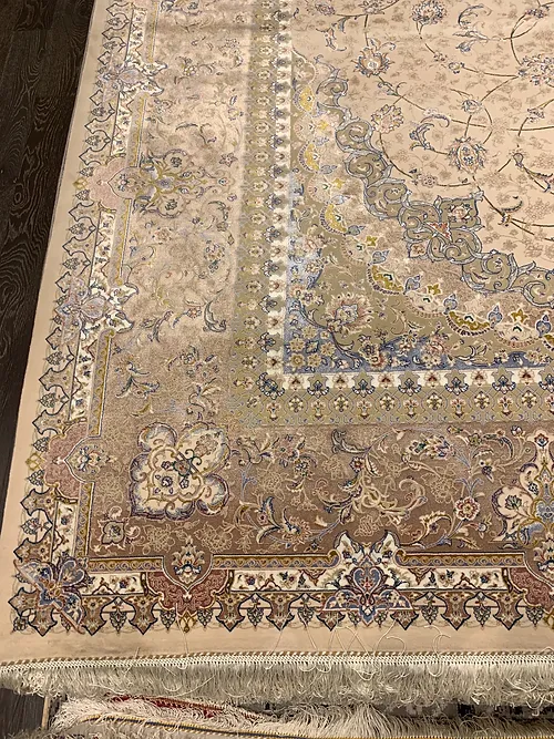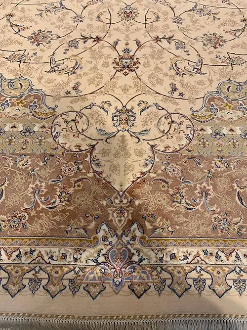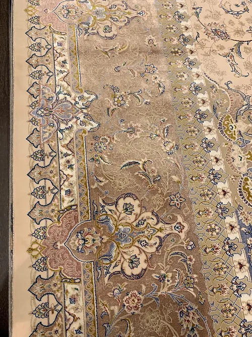 Here is a very beautiful machine made Persian rug. The design is Qum (Ghom). The size is 6’ 7” x 9’ 7”. The color is beige background with light brown border. The material is bamboo silk. The shipping is for mainland USA. Outside of USA please inquire about shipping before purchasing this rug.