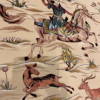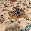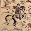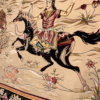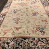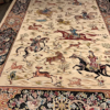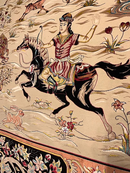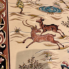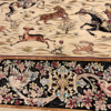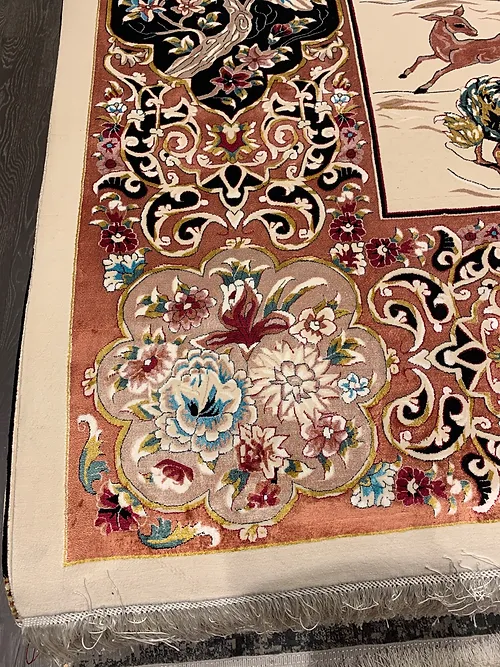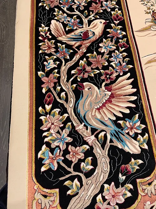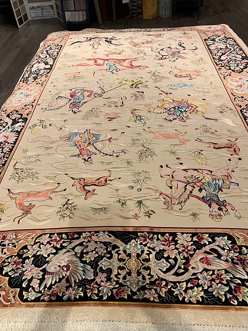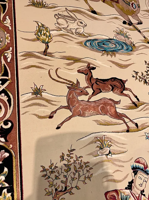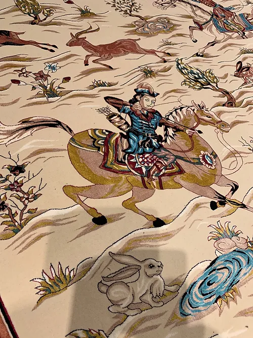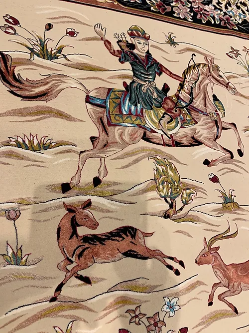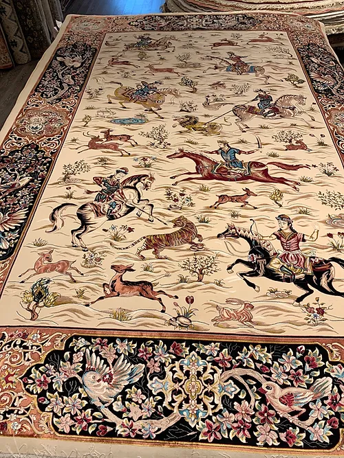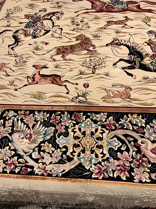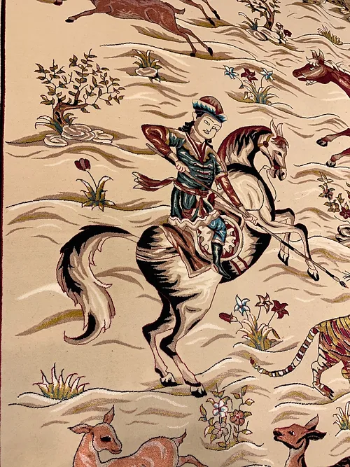 Here is a very beautiful machine made Persian rug. The design is Qum hunting scene The size is 6’ 7” x 9’ 7”. The colors are ivory background with peach and navy border. The shipping is for mainland USA. Outside of USA please inquire about shipping before purchasing this rug