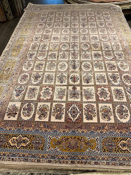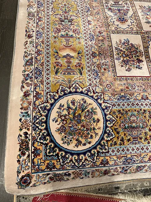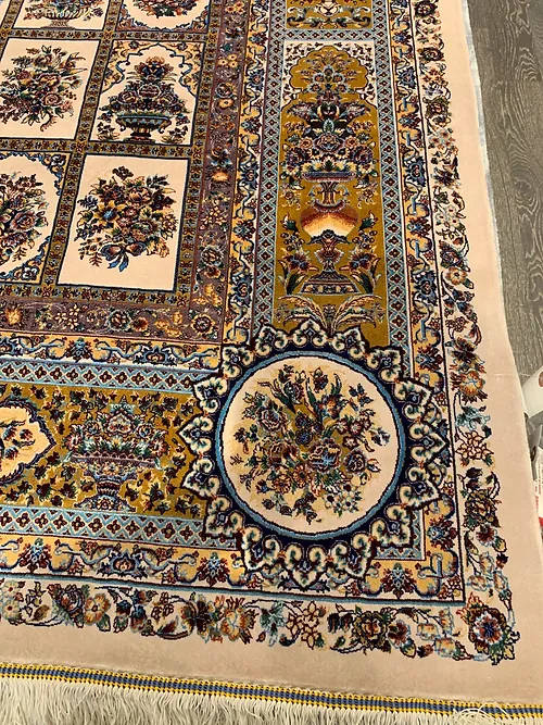Here is a very beautiful machine made Persian rug. The design is Qum (Ghom). The size is 6’ 7” x 9’ 7”. The color is ivory background with gold border. The material is bamboo silk. The shipping is for mainland USA. Outside of USA please inquire about shipping before purchasing this rug