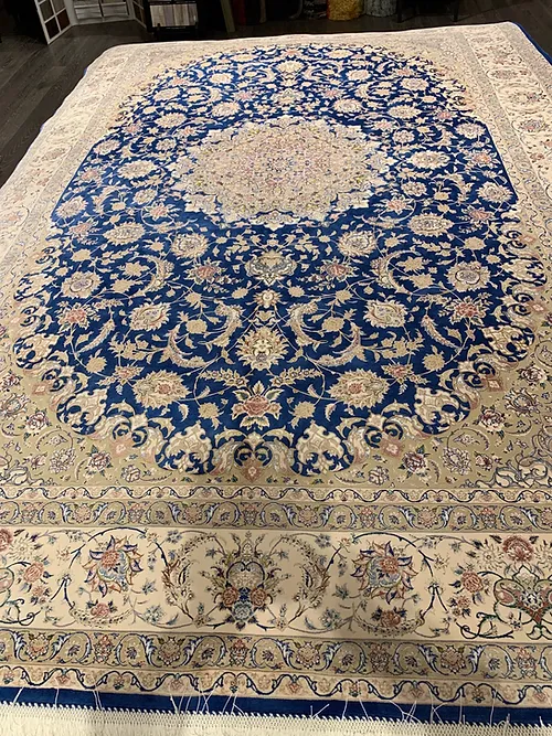 Here is a very beautiful machine made Persian rug. The design is Isfahan Esfahan).The size is 6’ 7” x 9’ 7”. The colors are royal blue background with ivory border. The shipping is for mainland USA. Outside of USA please inquire about shipping before purchasing this rug