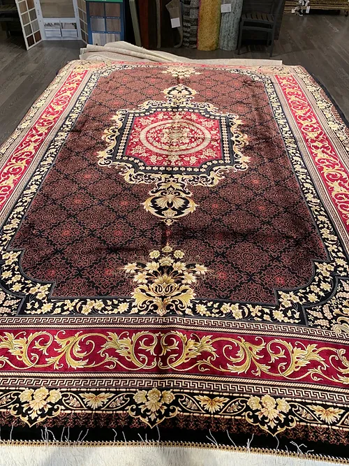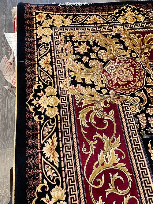 Here is a very beautiful machine made Persian rug. The design is Qum (Ghom). The size is 6’ 7” x 9’ 7”. The colors are black background with burgundy and gold border. The shipping is for mainland USA. Outside of USA please inquire about shipping before purchasing this rug