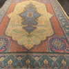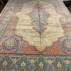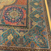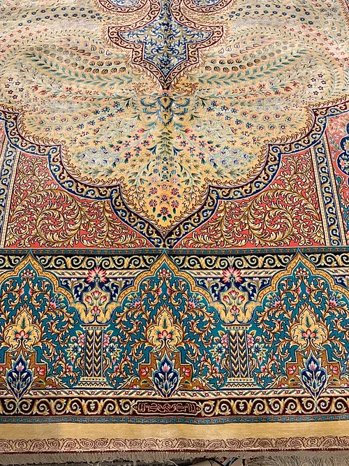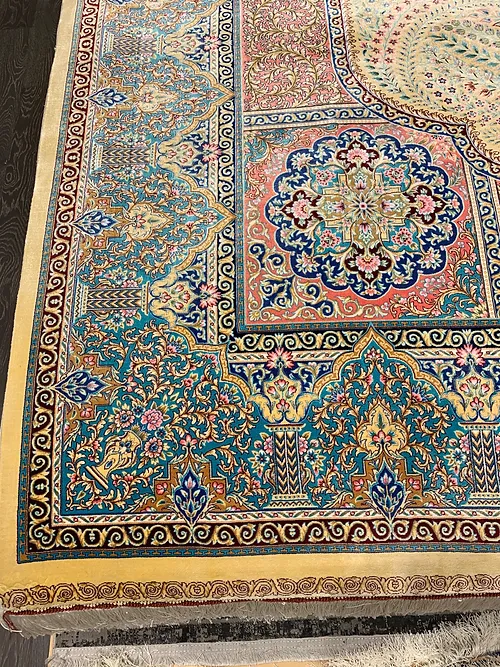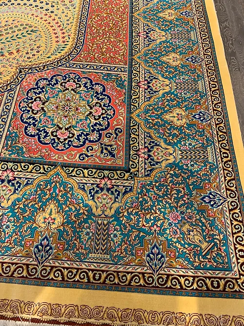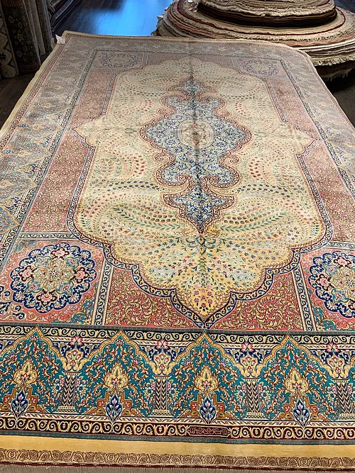 Here is a very beautiful machine made Persian rug. The design is Qum (Ghom). The size is 6’ 7” x 9’ 7”. The colors are background with turquoise and pink border. The shipping is for mainland USA. Outside of USA please inquire about shipping before purchasing this rug