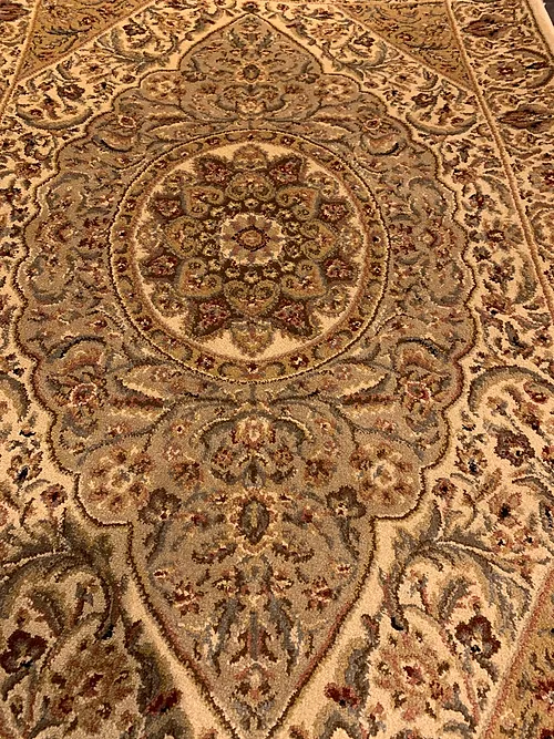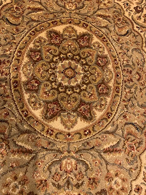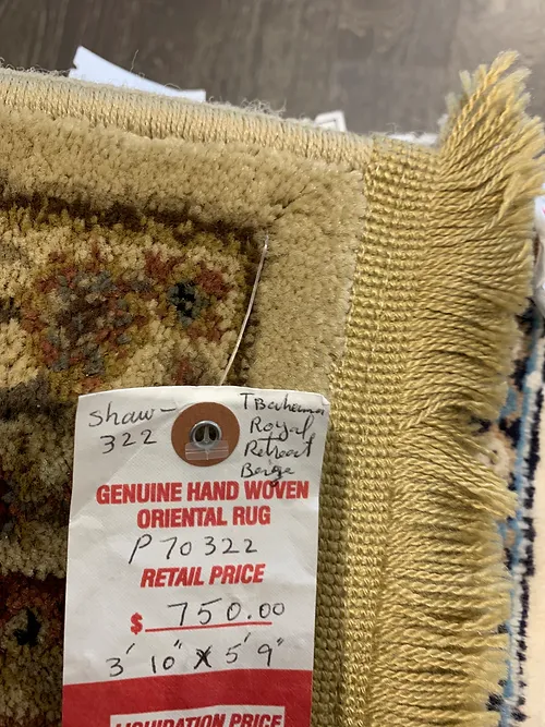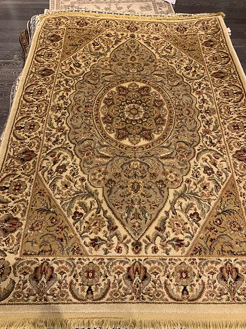 This is a machine made rug made in USA. The material is olefin. The size is 3’ 1” x 5’ 9”. The color is beige and green. The shipping is for mainland USA. Outside of USA please inquire about shipping before purchasing this rug.